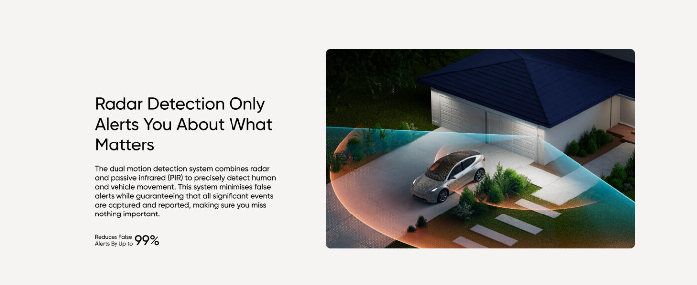 Each camera features a dual motion detection system combining Radar and passive infrared (PIR) to accurately detect human and vehicle movements.