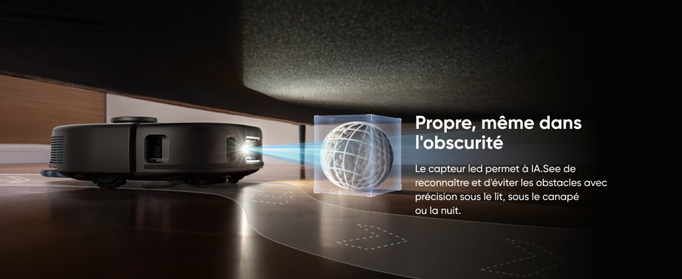Équipé de la technologie avancée IA.See™, le X10 Pro Omni identifie et contourne plus de 100 types d’objets : câbles électriques, chaussures, jouets, pieds de chaise, chaussettes oubliées. Même dans l’obscurité totale, grâce à sa lampe intégrée.