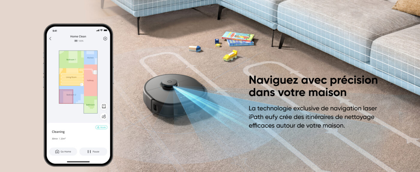 Le réservoir de 3 L couvre 2 à 3 nettoyages complets d’une maison de 150 m². La navigation laser iPath optimise chaque trajet, et la cartographie IA.Map 2.0 gère les pièces multiples sans se perdre.